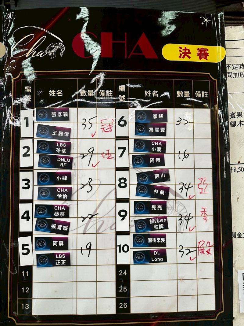 3️⃣決賽對抗取前五名,同隻數則PK 5分鐘,每隊先起兩隻蝦獲勝