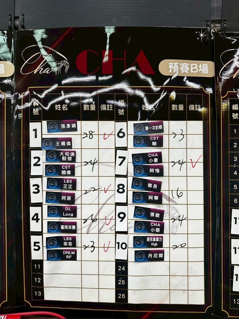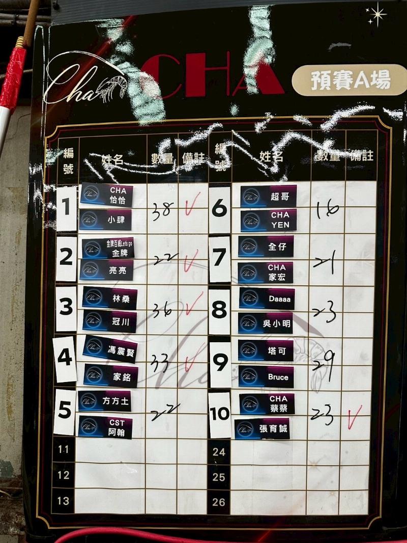 6. 預賽成績隻數若相同,則抽籤比大小決定;總決賽隻數相同則下場PK5分鐘,先起2隻蝦 並以手握住蝦為勝,如都未起蝦則抽籤比大小。